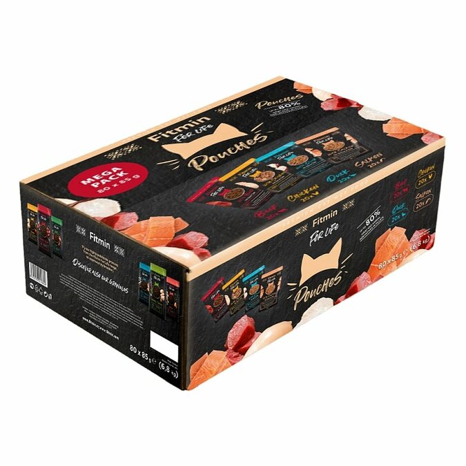 V balení se nachází 4 druhy kapsiček po 20 kusech: s hovězím masem, s kuřecím masem, s lososem a s kachním masem.