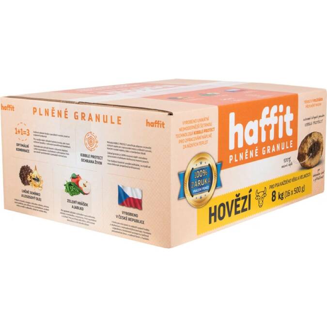 Pro plněné granule HAFFIT je typická chutnost a mimořádně vysoká využitelnost i kompletnost živin. Základem jsou vybrané kvalitní suroviny, převážně živočišné. Unikátní je zpracování technologií KIBBLE PROTECT do třívrstvého polštářku. Hlavní součást granule (66 %) je masová náplň zpracovaná za nižších teplot, aby se horkem nenarušila hodnota a využitelnost živin. Maso je ochráněno dobře propečenou křupavou vrstvou a opatřeno vrchní vrstvičkou s bylinkami. KIBBLE PROTECT – ochrana živin.
