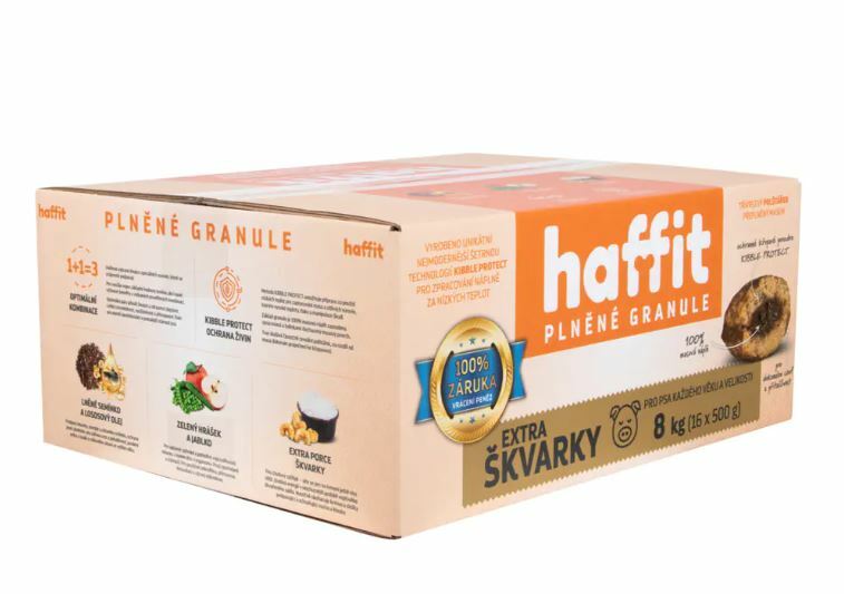 Pro plněné granule HAFFIT je typická chutnost a mimořádně vysoká využitelnost i kompletnost živin. Základem jsou vybrané kvalitní suroviny, převážně živočišné. Unikátní je zpracování technologií KIBBLE PROTECT do třívrstvého polštářku. Hlavní součást granule (66 %) je masová náplň zpracovaná za nižších teplot, aby se horkem nenarušila hodnota a využitelnost živin. Maso je ochráněno dobře propečenou křupavou vrstvou a opatřeno vrchní vrstvičkou s bylinkami. KIBBLE PROTECT – ochrana živin.